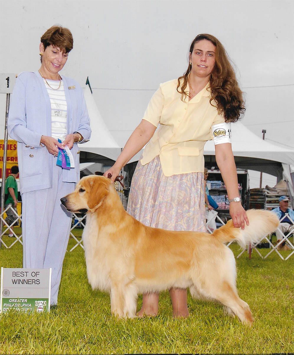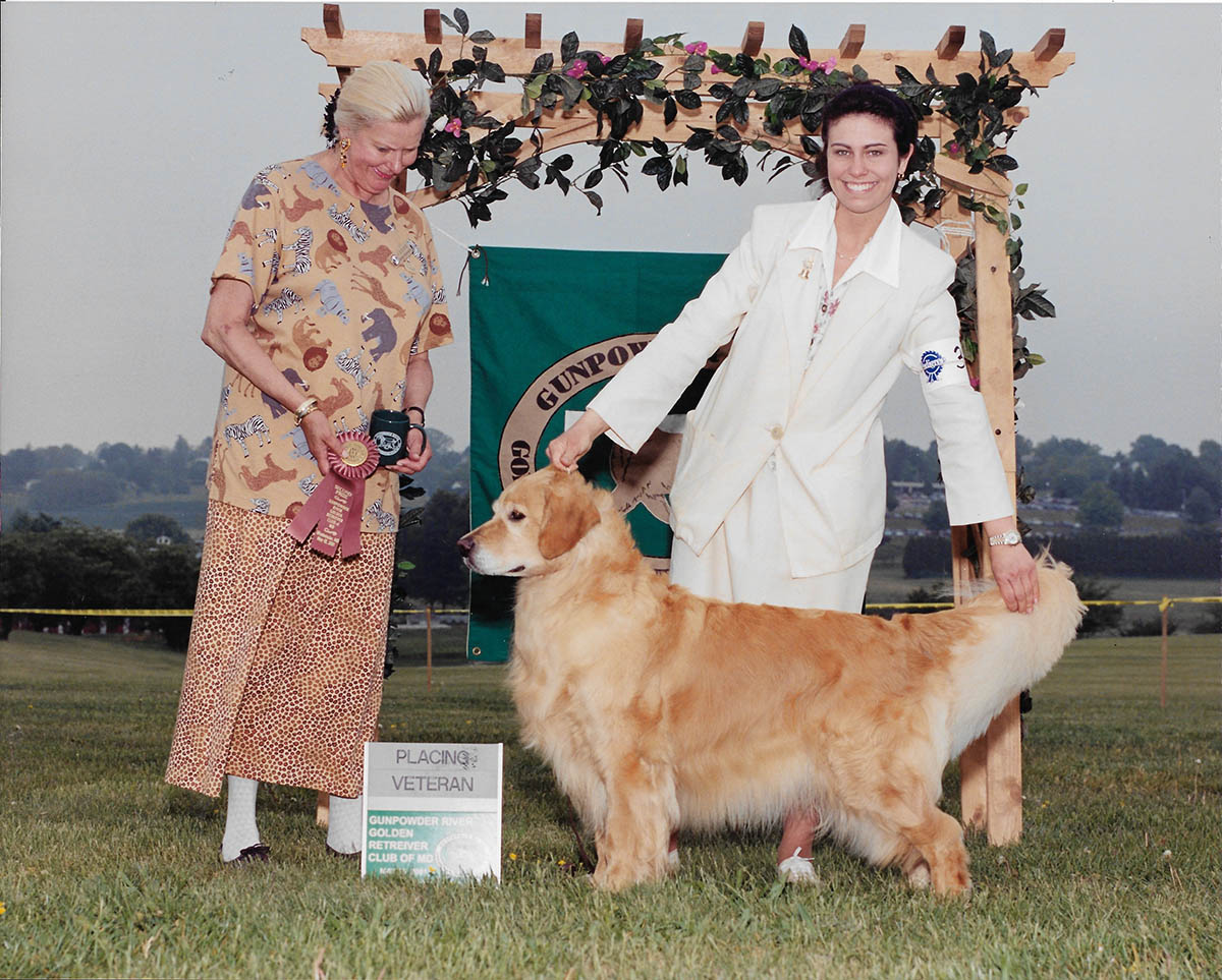 Ginger was my first golden retriever. Ginger was a rescue. I answered an add in the newspaper selling golden retriever puppies. They woman on the phone said all the puppies were spoken for, they were keeping a boy and they were going to have the mother euthanized. I told her please do not do anything with the mama dog, we would be right over. At 14 years old, I begged my mother to take me to get this dog. I had always wanted a golden. When we arrived, she was very skittish and vomited all over me several times on the ride home. She was afraid of people and would cower and urinate every time she was approached. We saw another ad in the newspaper inviting people to the restart of the Gunpowder River Golden Retriever Club of Maryland. This is how I met Ginny and Jennifer Boyle. Ginny worked with me for months to get Ginger socialized and able to show in Junior Showmanship. Ginger was a challenge, but I am forever thankful for her as she taught me so much.