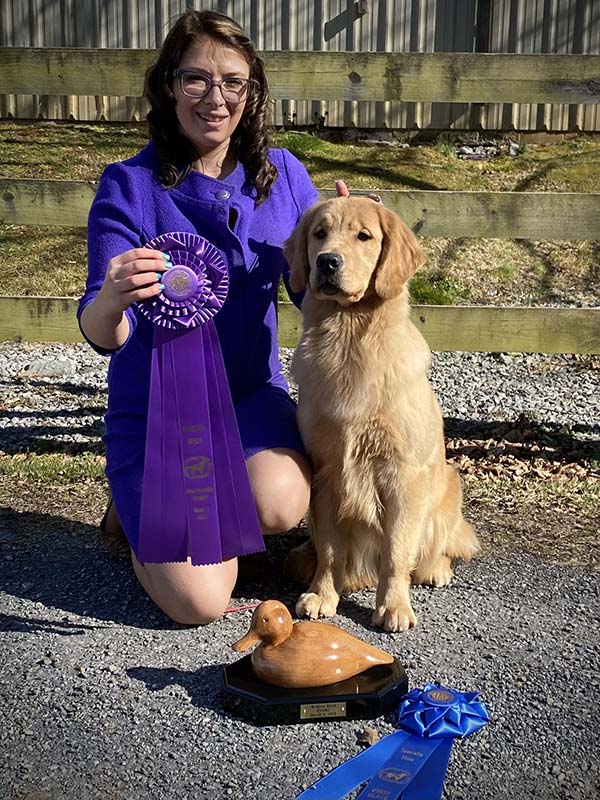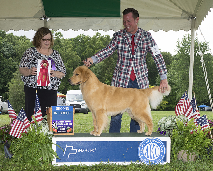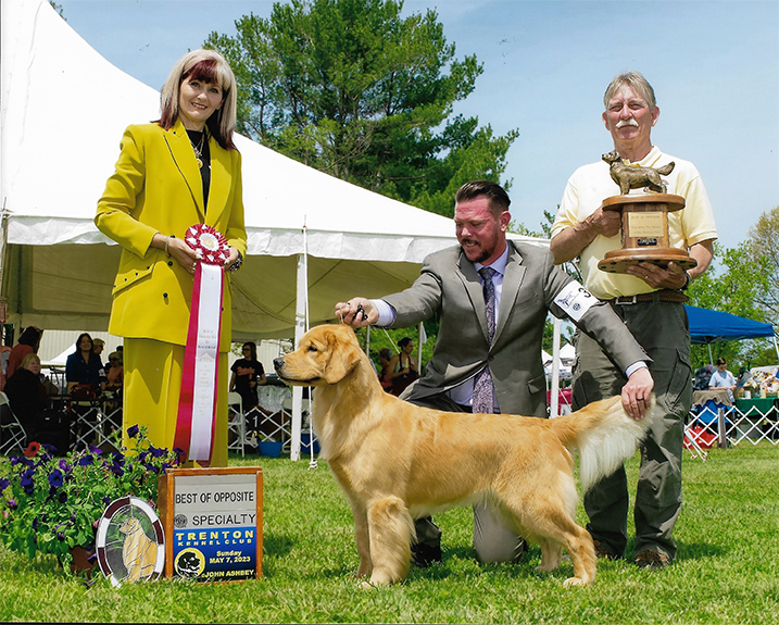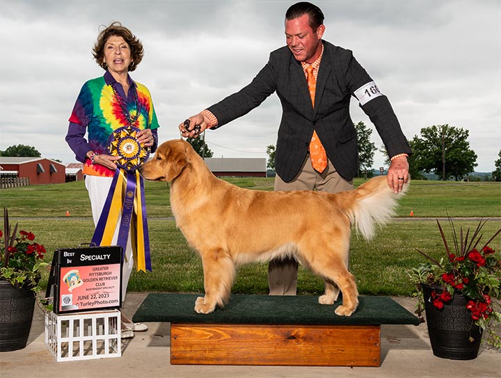Maisey is a multiple best in specialty winner, multiple group placing and won select bitch at the 2023 Westminster Kennel Club Show. With her exceptional type and clean, effortless movement, in three months, Maisey and Howie made it into the Top 20 and completed her Bronze Grand Champion title. She finished the year in June 2023 as the #6 golden bitch, #16 Breed and #17 All Breed! In the month of July 2023 she has had 8 Best of Breed wins and 4 Group Placements in highly competitive sporting groups. We are so proud of this team!