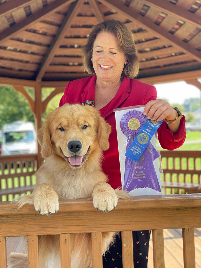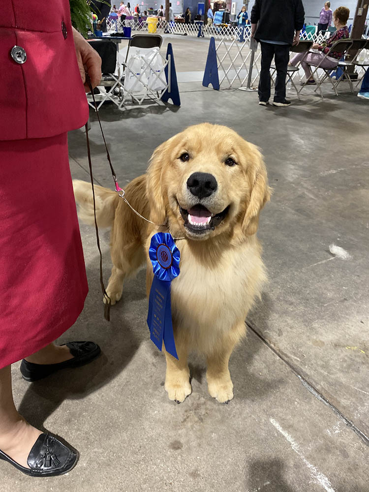 Jen and Ace at the Potomac Valley GRC Specialty winning Reserve Winners Dog and Best Puppy