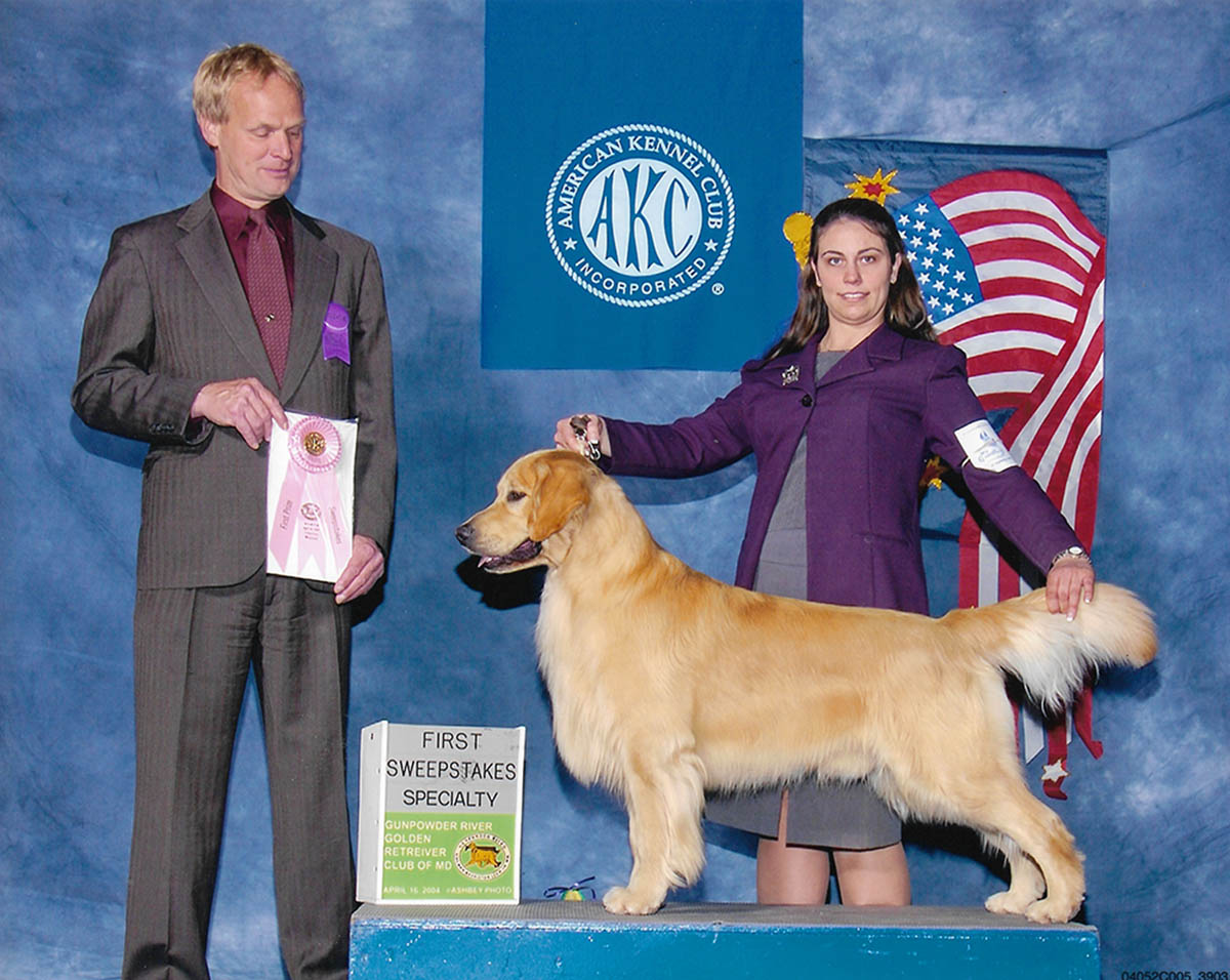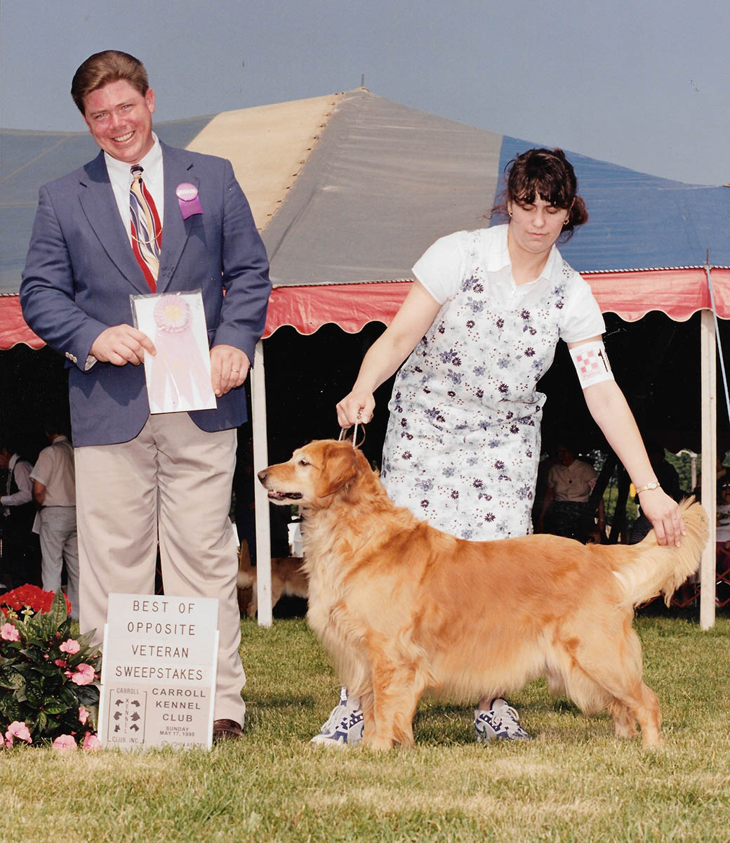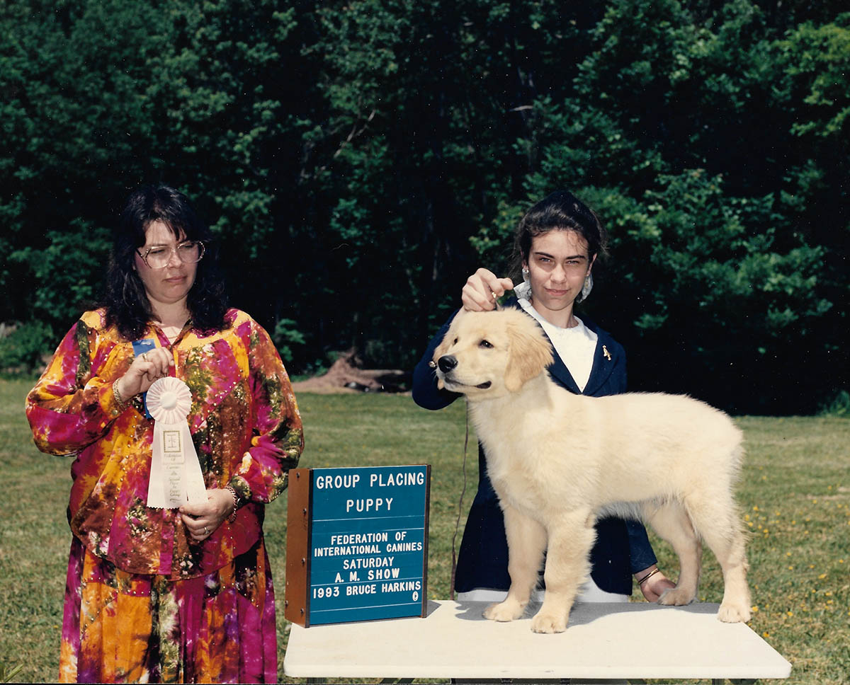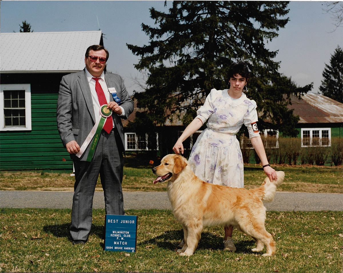 Ginger was my first golden retriever. Ginger was a rescue. I answered an add in the newspaper selling golden retriever puppies. They woman on the phone said all the puppies were spoken for, they were keeping a boy and they were going to have the mother euthanized. I told her please do not do anything with the mama dog, we would be right over. At 14 years old, I begged my mother to take me to get this dog. I had always wanted a golden. When we arrived, she was very skittish and vomited all over me several times on the ride home. She was afraid of people and would cower and urinate every time she was approached. We saw another ad in the newspaper inviting people to the restart of the Gunpowder River Golden Retriever Club of Maryland. This is how I met Ginny and Jennifer Boyle. Ginny worked with me for months to get Ginger socialized and able to show in Junior Showmanship. Ginger was a challenge, but I am forever thankful for her as she taught me so much.