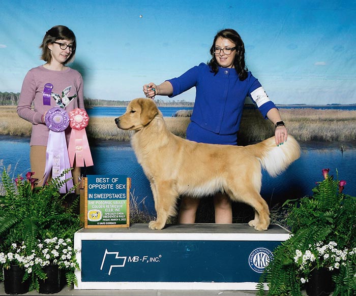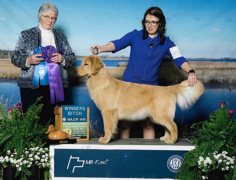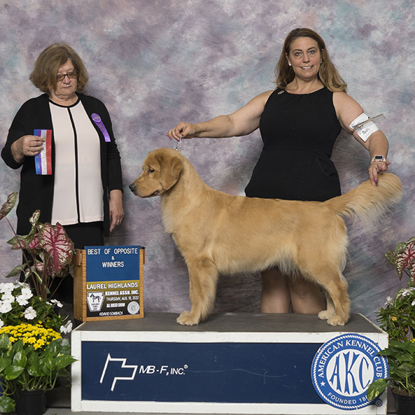 Maisey is a multiple best in specialty winner, multiple group placing and won select bitch at the 2023 Westminster Kennel Club Show. With her exceptional type and clean, effortless movement, in three months, Maisey and Howie made it into the Top 20 and completed her Bronze Grand Champion title. She finished the year in June 2023 as the #6 golden bitch, #16 Breed and #17 All Breed! In the month of July 2023 she has had 8 Best of Breed wins and 4 Group Placements in highly competitive sporting groups. We are so proud of this team!